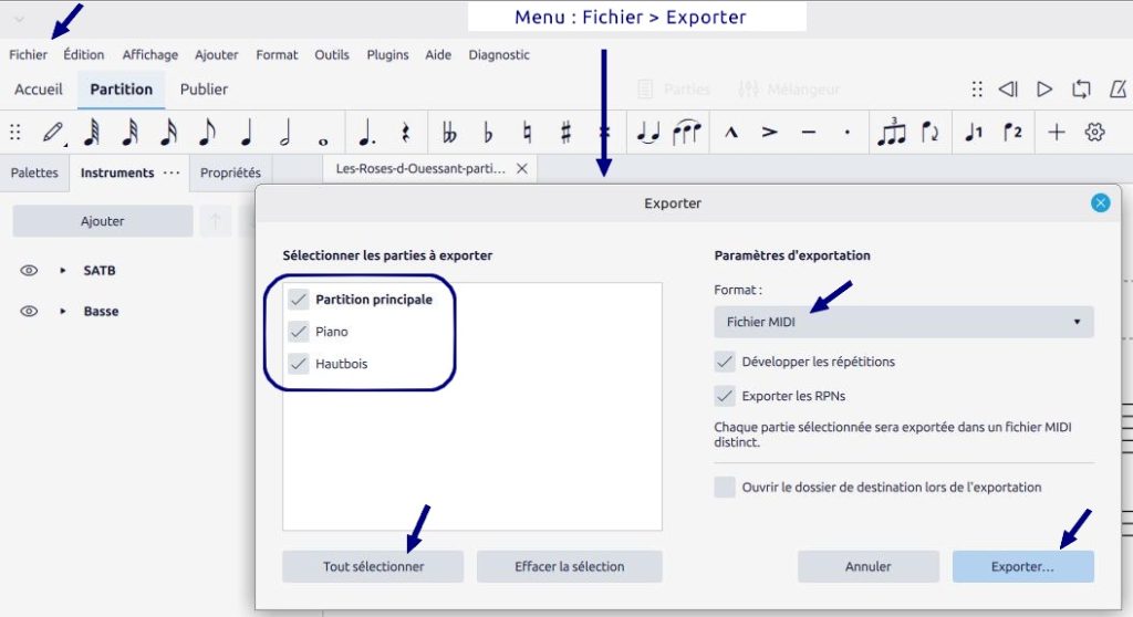 Une fois que la partition est terminée, on peut l’exporter en fichiers MIDI et mp3.
